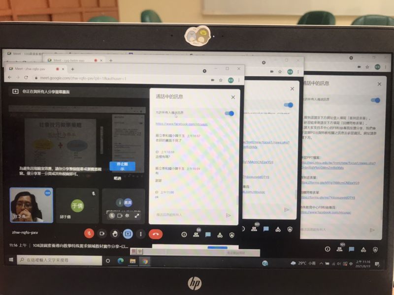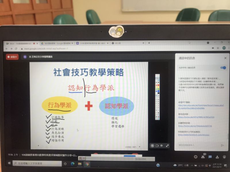 由於受新冠疫情影響,此次研習採Google meet線上視訊會議的方式進行課程,由於錯估線上會議室容納人數,緊急加開第二及第三會議室,讓報名教師能一同聆聽此次研習。本次研習有98.8%的教師覺得在教學實務上有很大的幫助,也覺得研習講師非常專業,有99.4%的 教師透過這次研習對身心障礙學生社會技巧之輔導有很大的助益,對於研習整體滿意度達97%,唯在採google meet線上視訊會議的形式上,由於是初次辦理線上研習類型的課程,且因錯估人數加開會議,導致有些教師登不進去而放棄課程,滿意度僅達81.2%。此次報名總人數達376人,錄取247人,最後實際參與人數為220人。