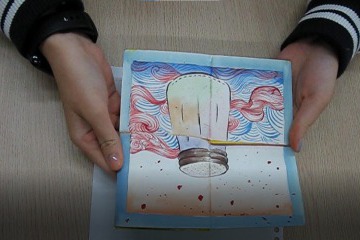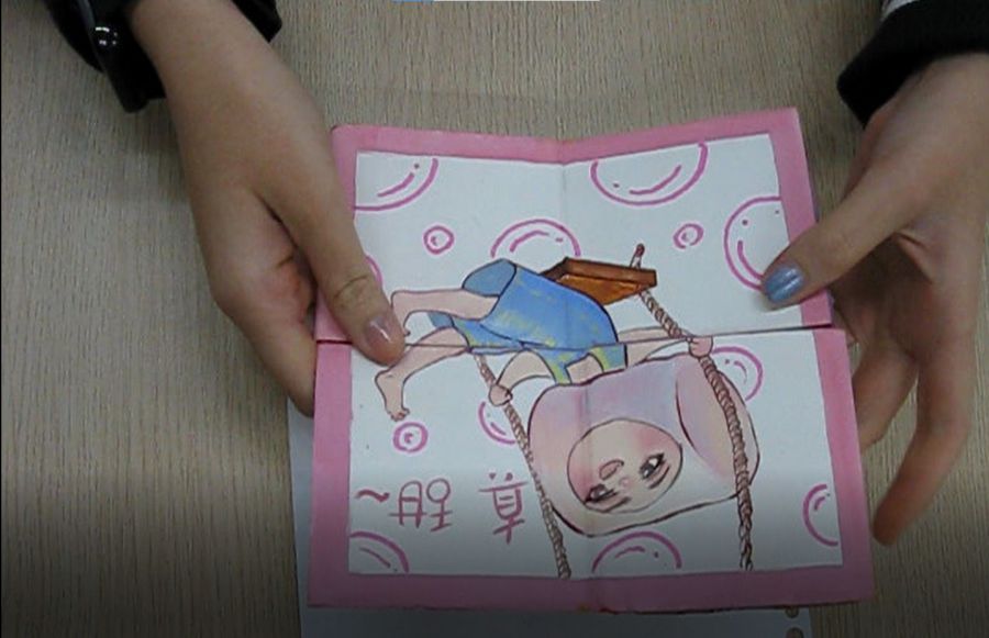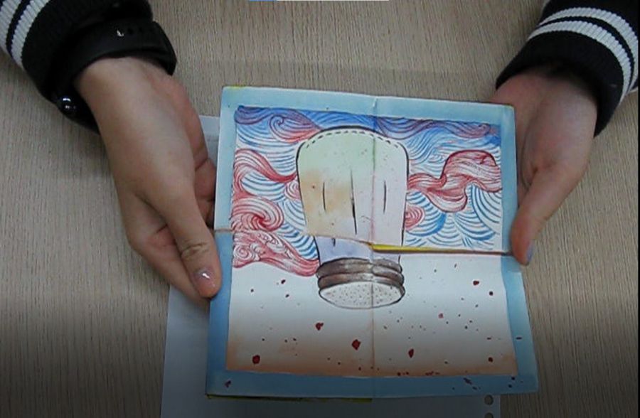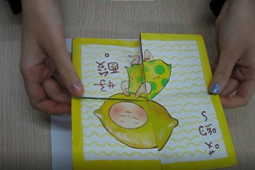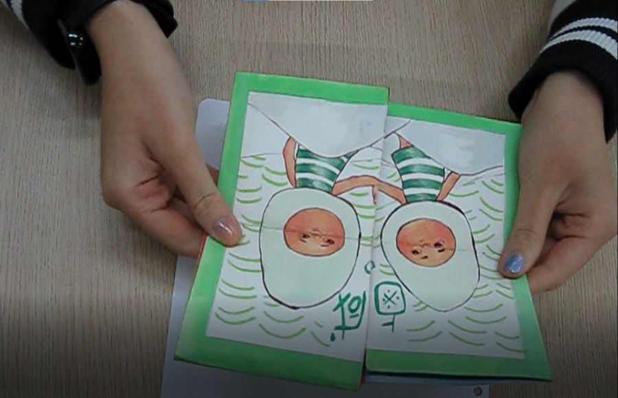 1. 老師引導學生製作可以連續呈現六個畫面或場景的道具「六面魔術書」: (1)由左向中→右摺 (2)由上向中→下摺 (3)由右向中→左摺 (4)由下向中→上摺並塞入; 2. 學生自訂主題,設計繪製「六面魔術書」的畫面; 3. 例如: (1)藍色邊框與整齊排列的綿延弧線(調味罐) (2)綠色邊框與雙弧並列的短線(海藻) (3)紅色邊框與三角形(辣椒) (4)紫色邊框與緩慢的波浪線條(苦瓜) (5)粉紅色邊框與圓形泡泡(棉花糖) (6)黃色邊框與興奮抖動的波浪(檸檬)。