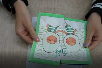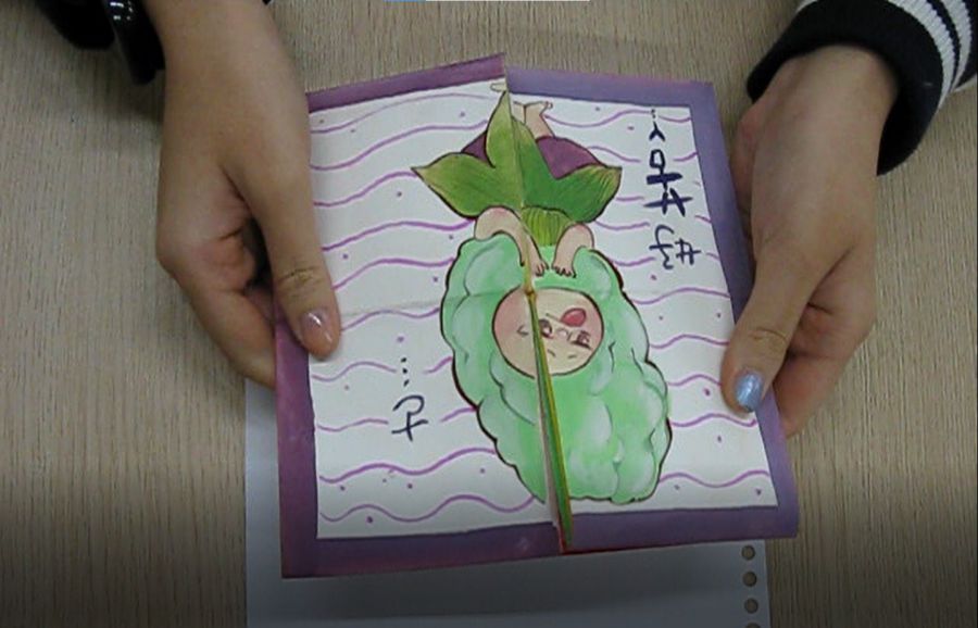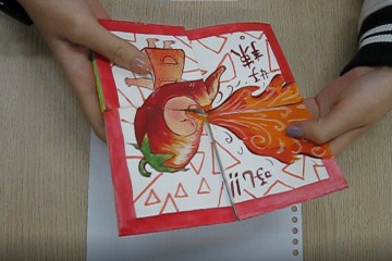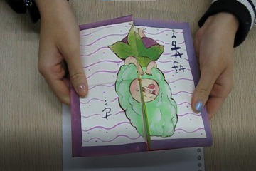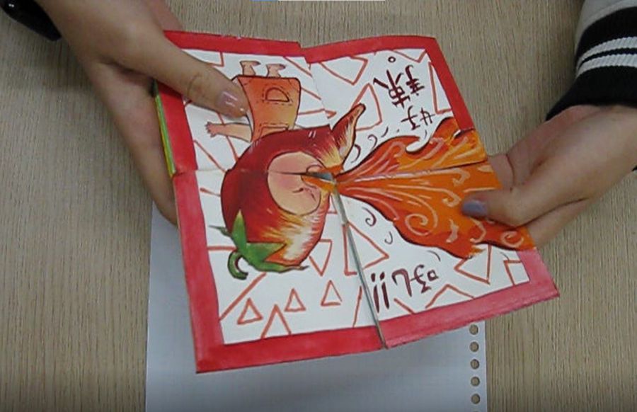 1. 學生操作「六面魔術書」,一面呈現繪本圖畫,一面進行特定「主題」的故事說演; 2. 例如:有關「味覺」的故事說演 (1) 第一個畫面(故事主題) (2) 由中向左、右外翻→第二個畫面(鹹。) (3) 由中向上、下外翻→第三個畫面(吼!!好辣。) (4) 由中向左、右外翻→第四個畫面(ㄜ……好苦ㄚ。) (5) 由中向上丶下外翻→第一個畫面(調味罐) (6) 由中向上丶下外翻→第五個畫面(好甜~) 由中向左丶右外翻→第六個畫面(哎喲~好酸。)
