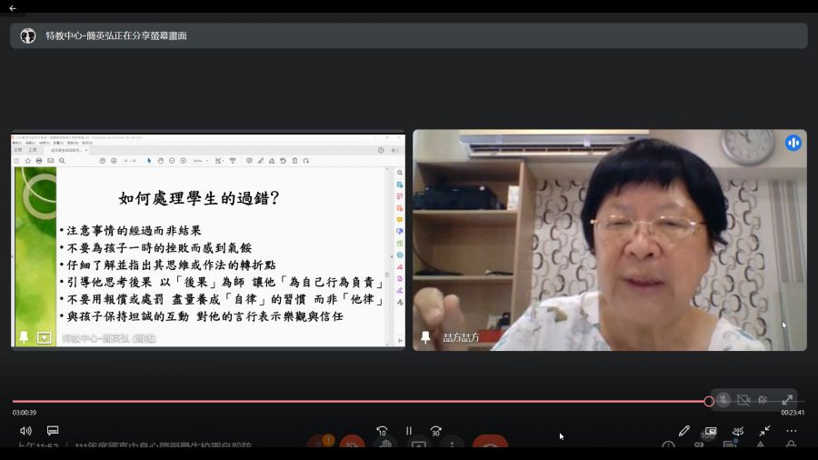 因受疫情影響,本次研習採線上方式舉辦,以GOOGLE MEET軟體進行講座,在講師精彩的演說下,不只在理論上加以著墨,並從職業生涯中遇到的各種自殺狀況,搭配課堂上的重點舉例說明,讓學員們更能輕易暸解現代學生及身障生在校園內會遭遇到的問題,像是霸凌、同儕關係、師生關係、課業壓力…等,講師提供各種方法供在場學員們參考,讓學員們在班級經營上更加得心應手,此次回饋,學員們覺得講師非常實際而且用心,都講到重點,可以在教學過程中激發出更多想法。參加研習人數共141人,