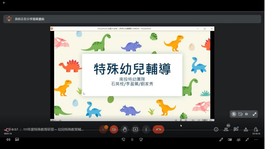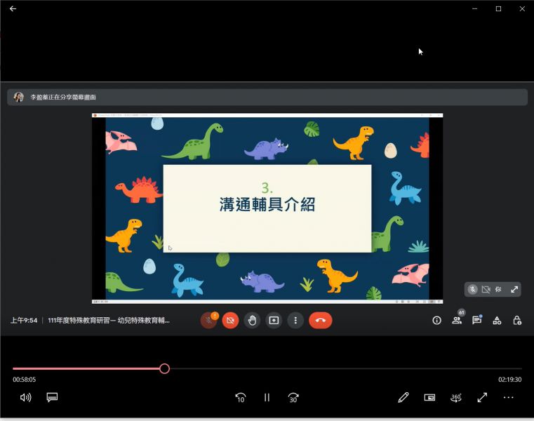 因受疫情影響,本次研習採線上方式辦理,講師以生動活潑的方式分享自身帶領資源班的經驗,以及介紹在課堂上使用的自製課堂教具,引起學員們的興趣,紛紛詢問教具的製作方式及材料取得管道,從分享的過程當中可發現學員們對於講師的教學方式頗有興趣,可以讓自己思考在教室裡如何運用研習內提到的方式與學生相處、溝通,整場研習下來,學員們覺得課程非常完整,又有實例說明,這樣能增加老師的具體經驗,並感覺受獲良多。參加研習人數共53人。