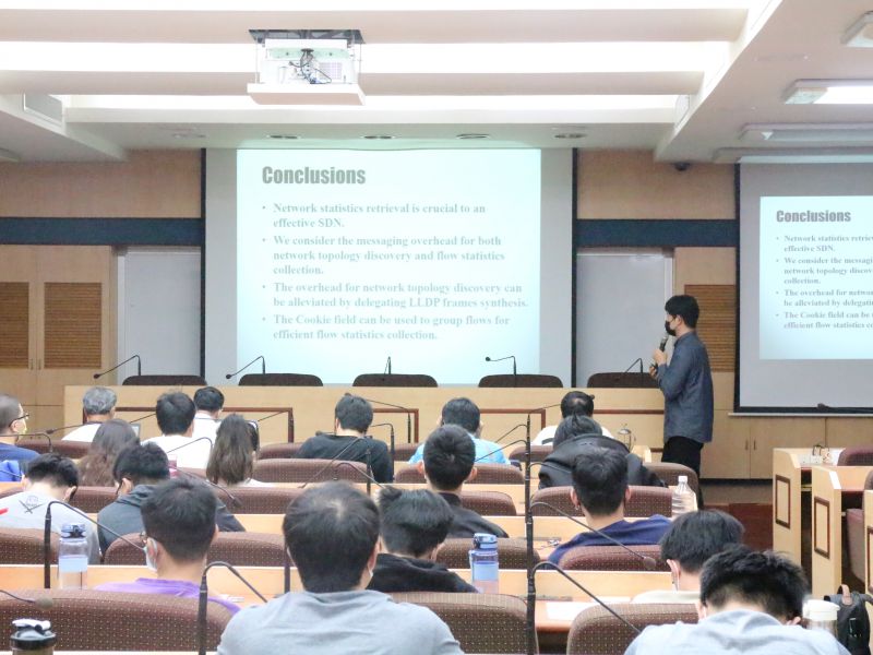 隨著科技進展網路已遍佈全世界,網路應用於通訊、各項服務上,為處理網路頻繁流量以及網路管理複雜性,軟體定義網路(SDN)成為熱門的話題。其設計架構在不更動硬體裝置的前提下使網路使用率、承載網路流量大幅提升,以及網路集中化控制的特性導致各大公司採用。因此軟體定義網路中的設計架構與巧思值得學生們學習,本次邀請網路領域專長的國立中興大學資訊科學與工程學系王丕中特聘教授蒞臨介紹軟體定義網路架構以及正確的網路狀態和資訊。