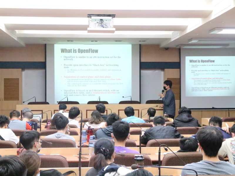 王丕中教授以軟體定義網路(SDN)基礎概念、網路拓樸(Network Topology)以及流量統計(Flow statistics)三個主題分享軟體定義網路架構,在軟體定義網路基礎概念上先從作業系統上切入軟體定義網路架構、介紹其需要執行之功能與重要協定Openflow,並闡述要解決的問題。在流量統計上介紹了應用程式資料寄送到網路,控制器計算路徑並進行封包傳送後,其網路的狀態與資訊,另外補充了在網路上面臨的問題,如網路延遲、網路壅塞。最後總結軟體定義網路在流量與網路管理上與傳統網路差異。