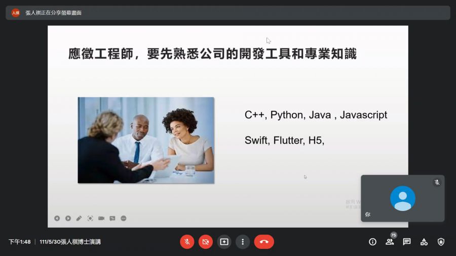 張人祺博士在台灣及中國皆有豐富工作經驗,從自身經歷及觀察,將台灣工程師在外國就業優勢及劣勢,分成多個面向講解給同學,引導同學開闊視野,多加思考在中國及其餘國家工作利弊,提供國外一線城市的薪資及物價,及生活需注意的事項,使未來想出國求職的同學有更明確的規畫,最後勉勵同學們,有足夠語言溝通與資訊能力,選擇工作可不被地域所限制,鼓勵同學精進自我,在學期間多實習,加強外語溝通能力,使未來有更好的生活品質。