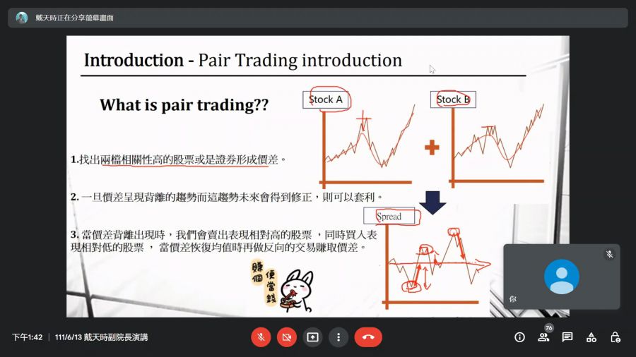 戴天時副院長分享股票或證卷預測的重要知識、量化交易的特點,以及利用機器學習和標記技術所建構的配對交易策略原理,其中分別針對資料預處理方式、模型建構與改善方法,實驗結果與討論依序進行介紹。在實驗結果上著重告訴同學股票交易可能會有一定的滑價,看似成功的策略並不一定在真實交易上產生良好的報酬率,最後提及結合資訊技術的量化交易方式為現今和未來相當重要的賣點,勉勵同學可利用自身資訊科技長處發揮在投資上,善用資訊技術於生活應用中。