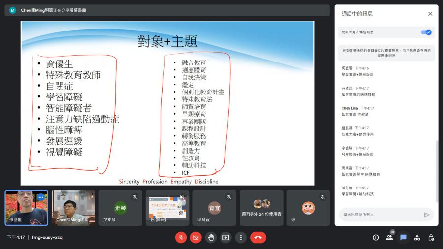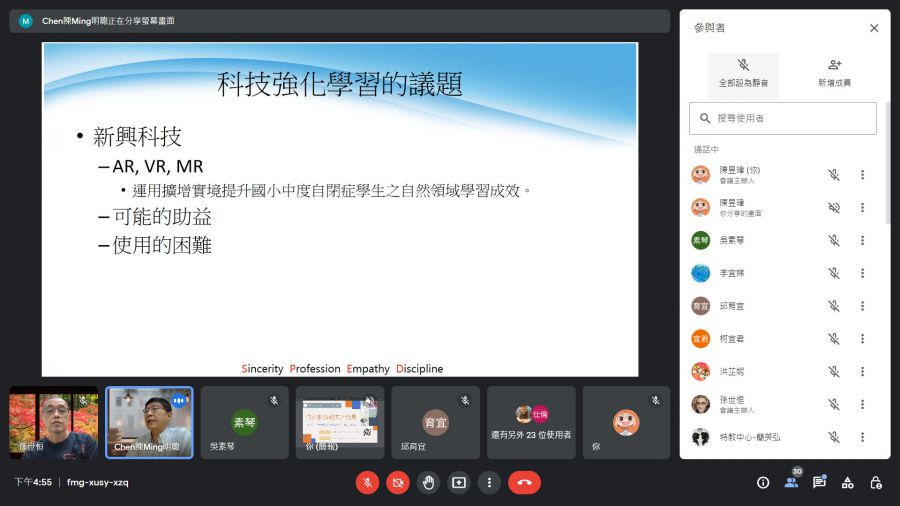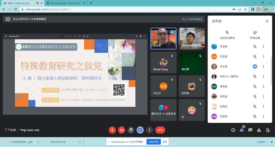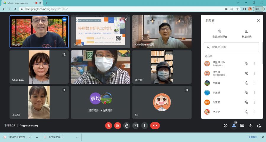因應現今科技日新月異與資訊流通便捷,對於學術研究議題方向與研究方法的革新在大環境潮流下,是迫在眉睫的重要議題。藉由演講者豐富的學識底蘊與深厚的實務經驗分享,深入暢談過往特殊教育方面的具體研究方向與方式,並探討目前教育實務中待答問題與科技導入方法,在扎根過往研究成果的同時,盼能啟迪並引動研究生參與創新,迸發新的花火,結合各式硬體與軟體設備科技,在研究方面創新創意發想並務實成就。另因應疫情,特採行google meet線上演講方式,降低群聚感染之風險的同時,突破時間與空間藩籬,真正達成學習無遠弗屆的精神。
