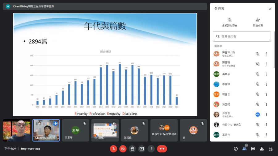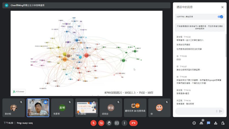 因應目前新冠肺炎與流行性感冒肆虐,降低人員聚集以避免疫情擴散傳播,本次演講特採線上會議方式(Google meet)進行。講者示範軟體VOSviewer執行視覺化關鍵字共現分析,提供近二十餘年的整體研究整理,包括主題、方式與學者發表文章數量。並開放學生實際參與如何藉由關鍵字分類連結,找出新的研究議題。並揭示結合實務工作與跟上國際潮流的重要性。